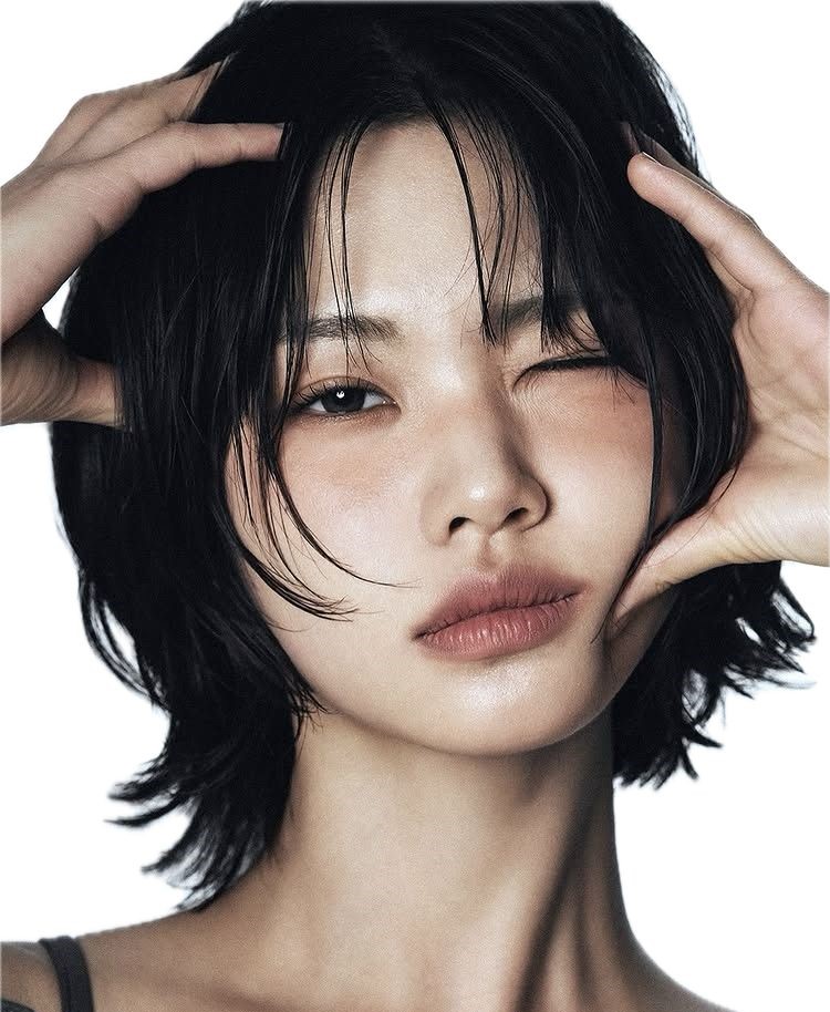 An asian woman with some hands touching her face.